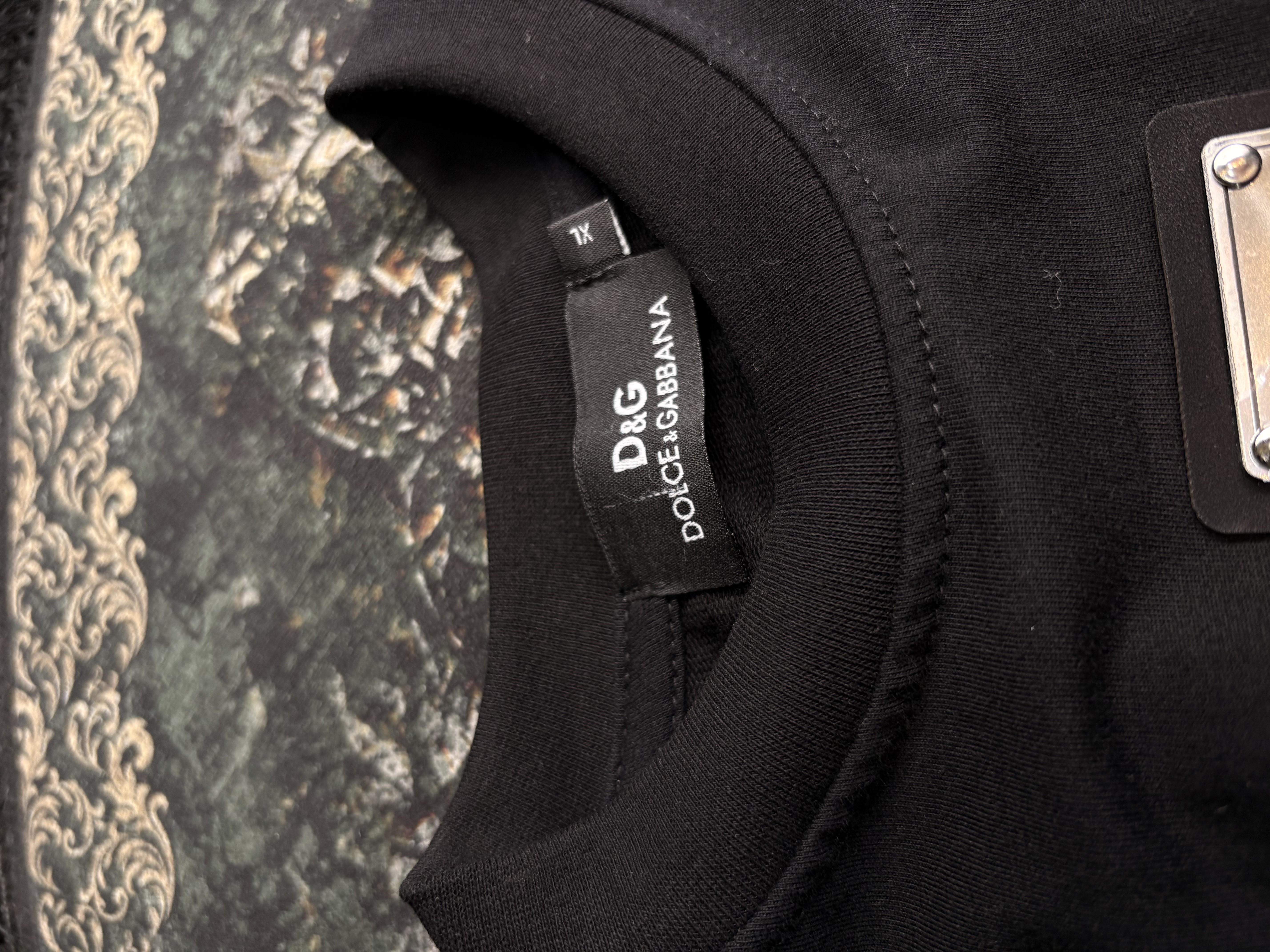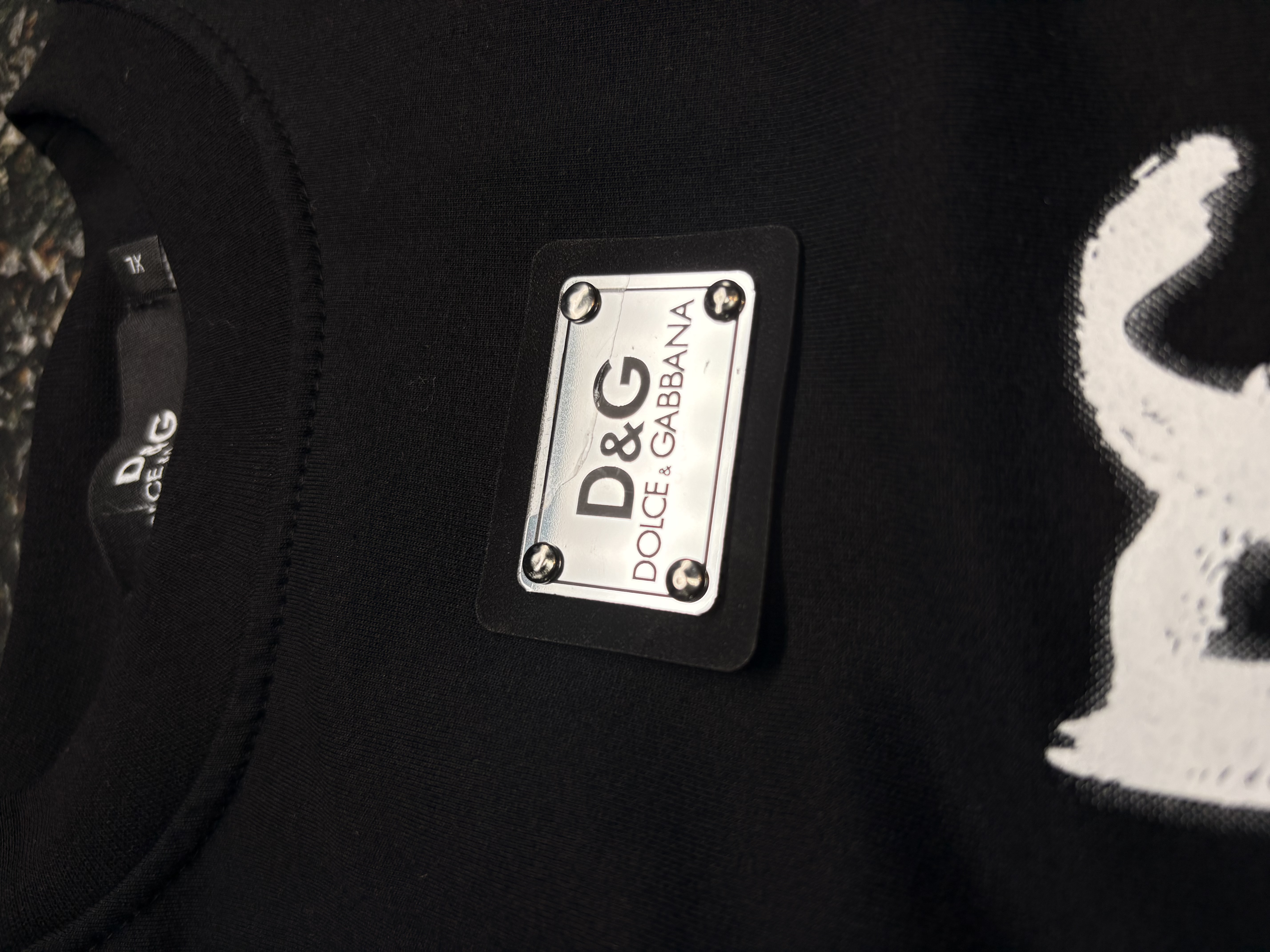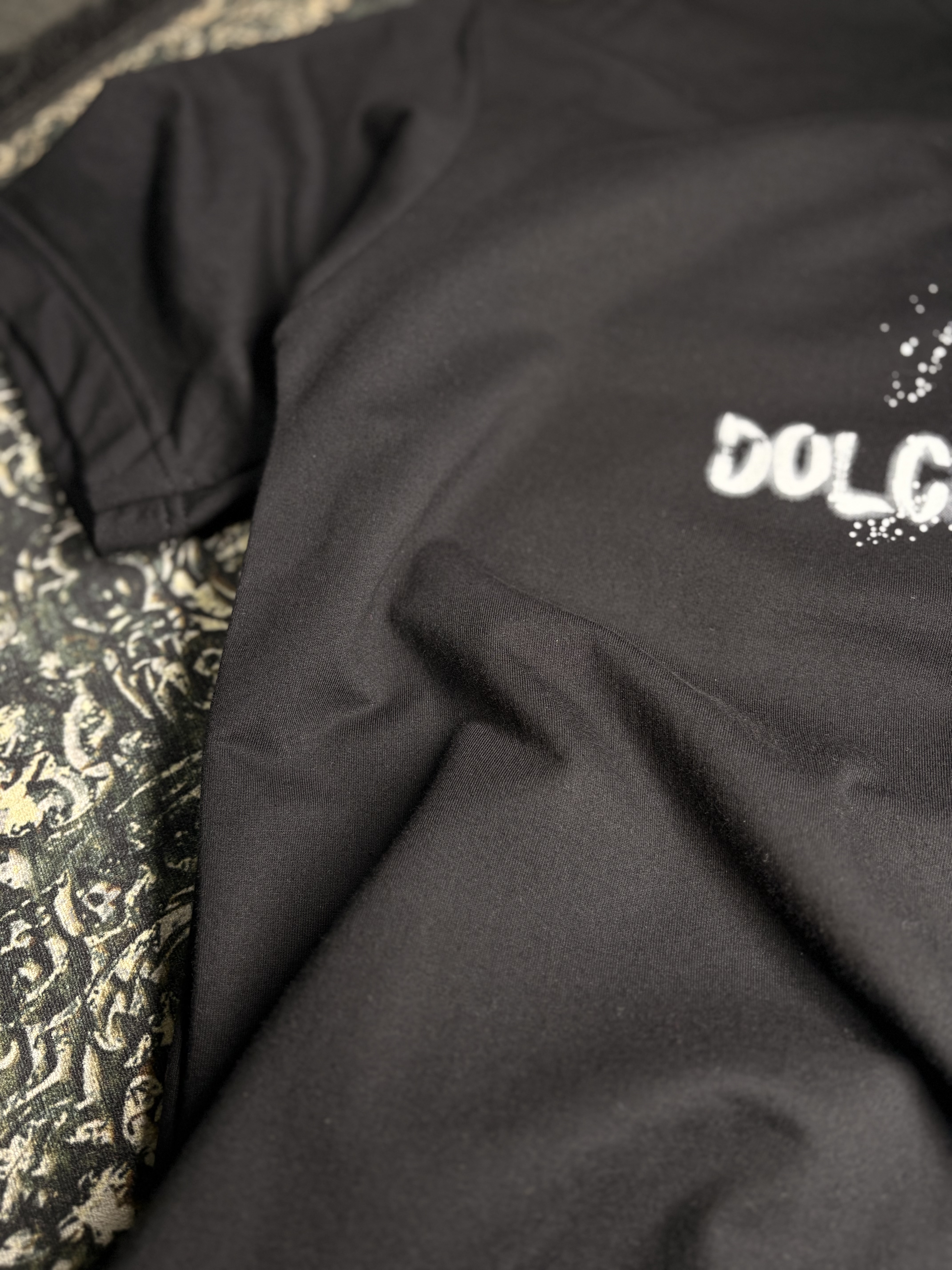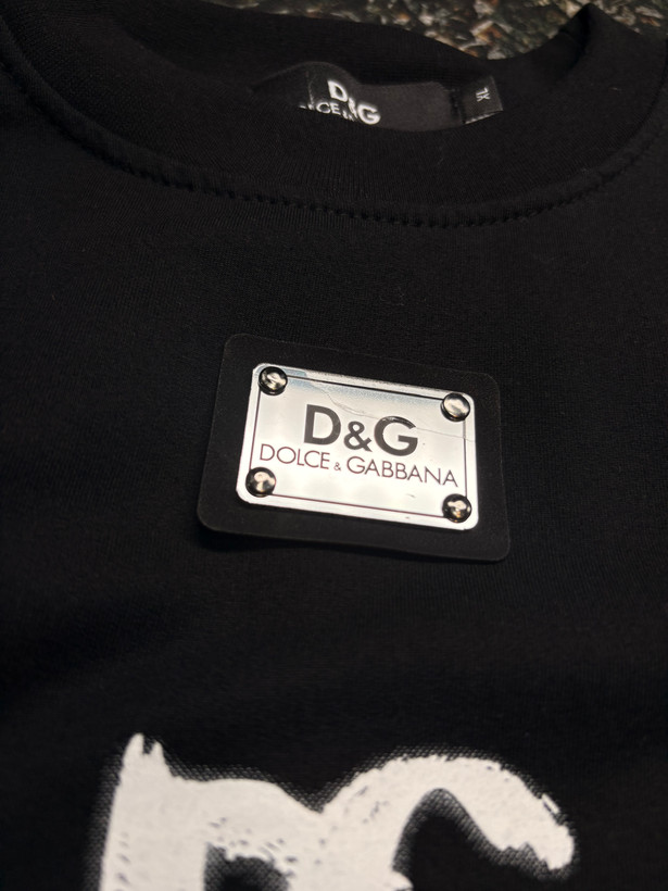 تیشرت مشکی با طرح اسپریشده DG و نوشتهی «DOLCHÉ GABBRANA – ITALYA».